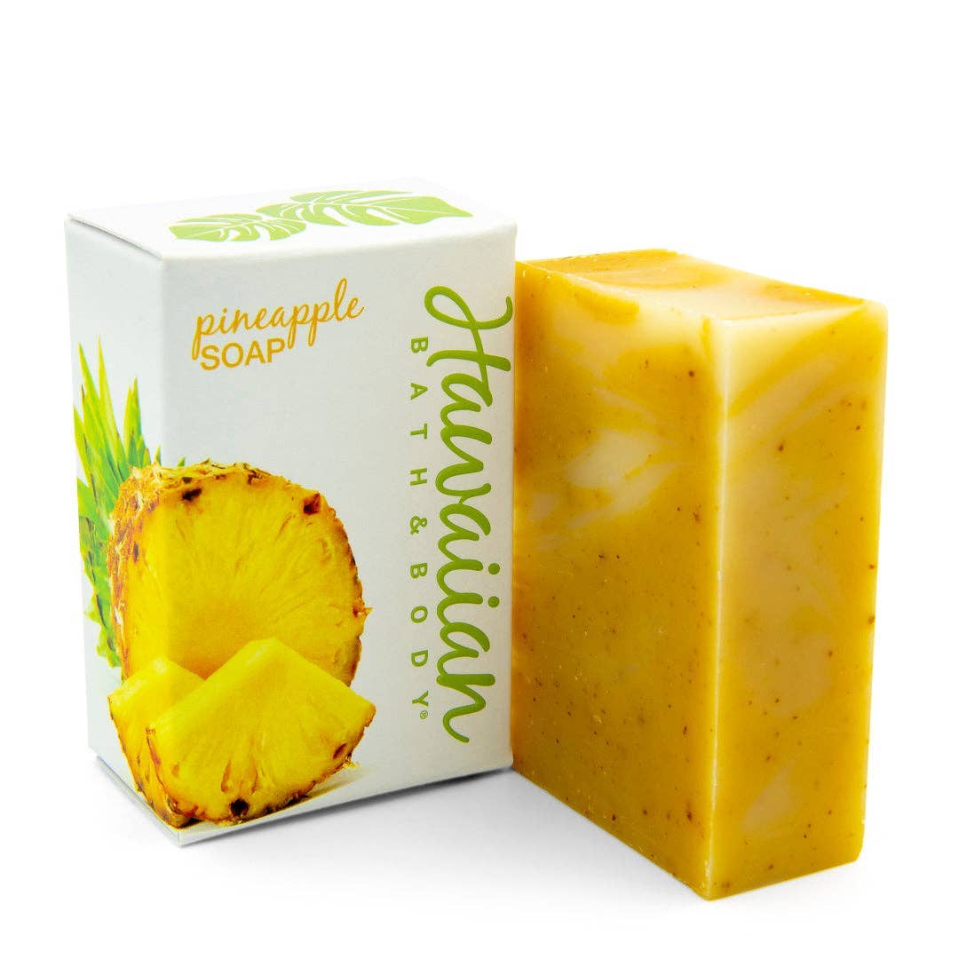 Pineapple Soap is an island must-have! Bring home a slice of Hawaii with our Pineapple Natural Soap! Pineapple fragrance is blended with pure essential oils to bring you this bar's sweet and fruity tropical scent. Citrus oils revitalize dull, oily complexions, while strengthening and toning tissues. Tangerine Peels harvested from our own trees add a nice exfoliating effect to this bar.